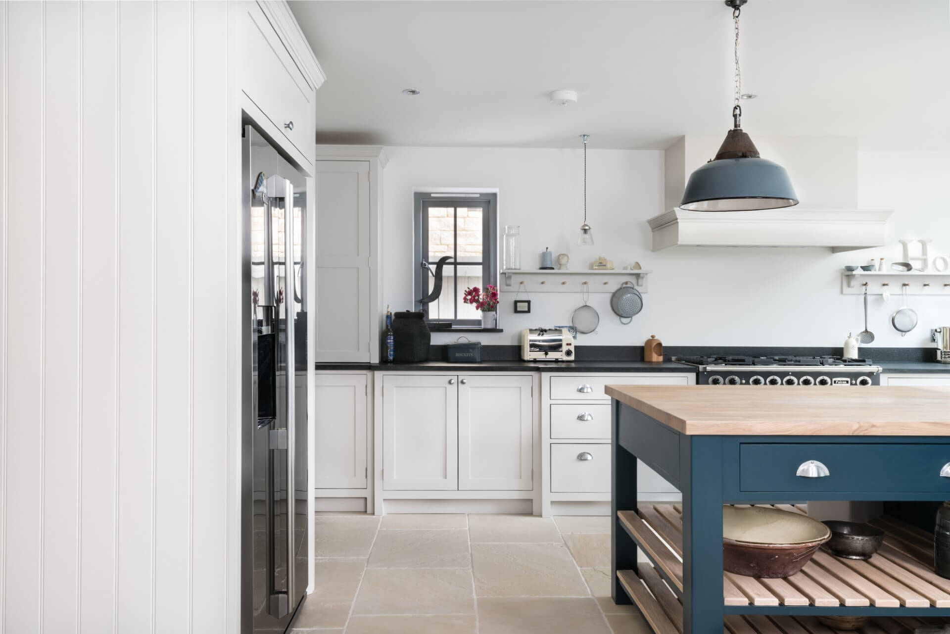 Resembling a working kitchen of the late 1800’s the traditional face frame and cabinet doors retain a heritage style. Even the cup handles and tumbled tile floor contribute to a certain era in British kitchen design.