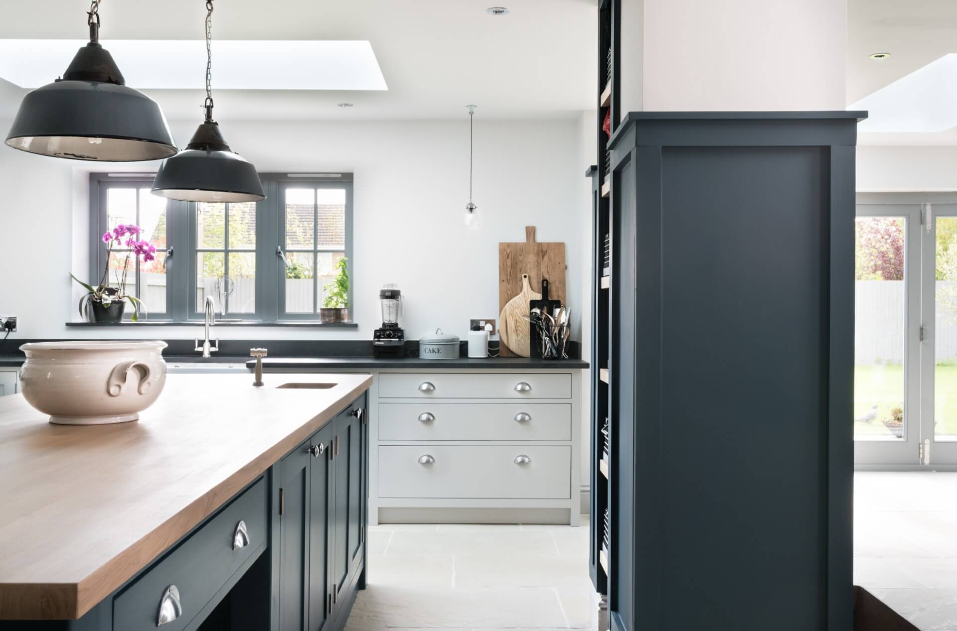 The lighting has been orientated to focus on various cooking zones, and the two tone colour scheme helps bring traditional kitchen character into the modern home.